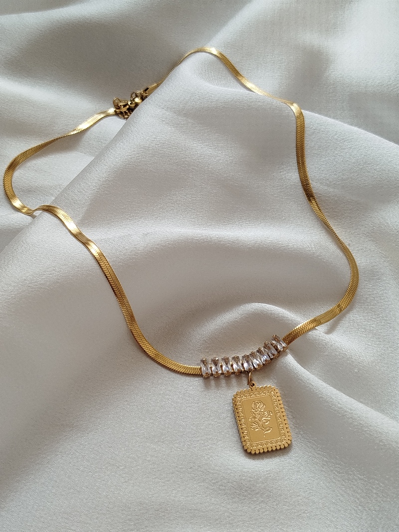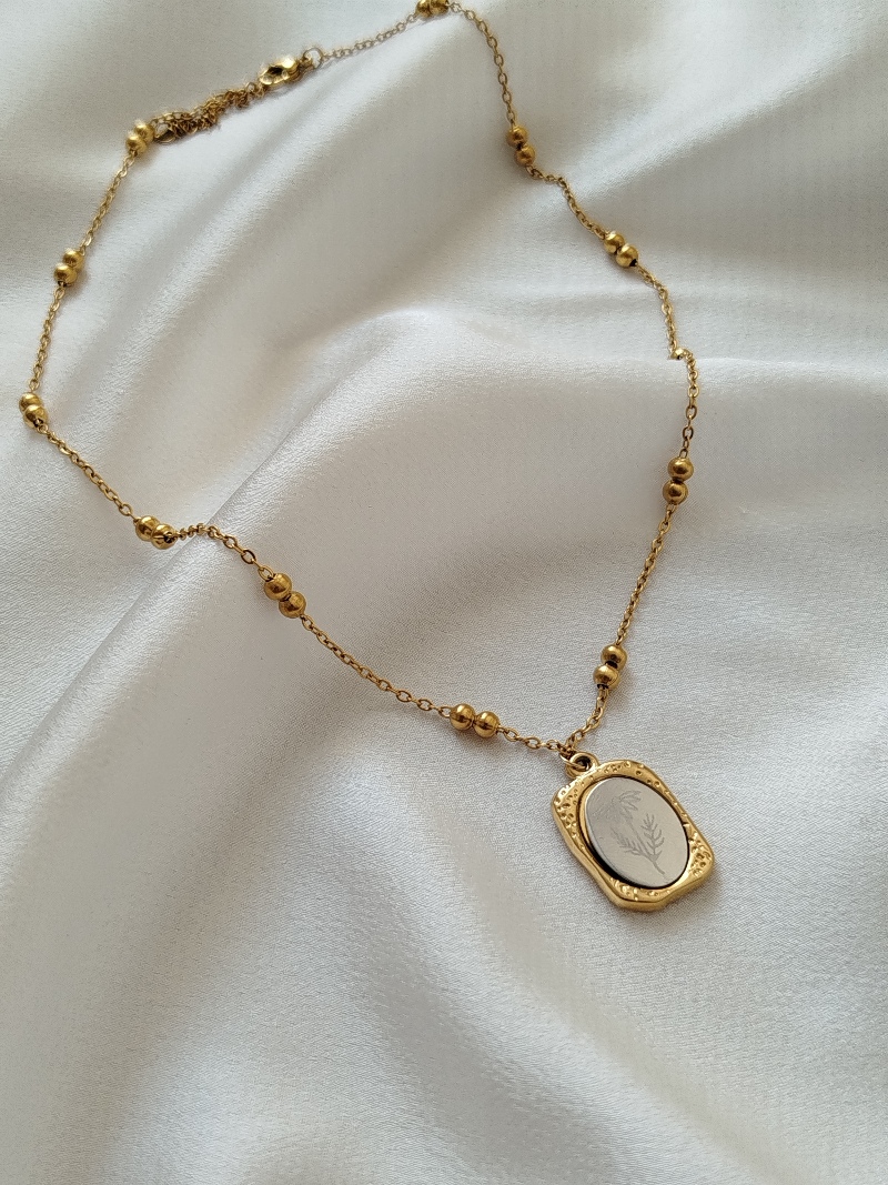 Çelik Gümüş Plaka Gül İşlemeli Vintage Gold Kolye